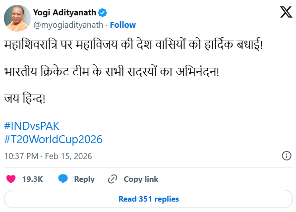 इस पर उत्तर प्रदेश के CM योगी ने X पर पोस्ट करके लिखा कि “महाशिवरात्रि पर महाविजय की देशवासियों को हार्दिक बधाई। इसके साथ ही उन्होंने आगे लिखा कि भारतीय क्रिकेट टीम के सभी सदस्यों का अभिनंदन”।