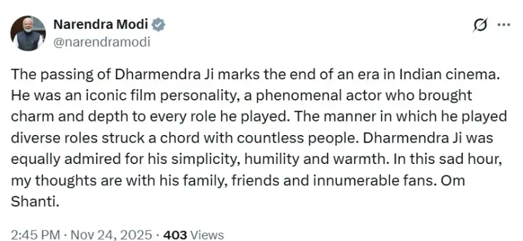 प्रधानमंत्री नरेंद्र मोदी ने धर्मेंद्र के निध/न पर गहरा शो/क व्यक्त करते हुए कहा, ‘धर्मेंद्र जी का निध/न भारतीय सिनेमा के एक युग का अंत है. वे एक प्रतिष्ठित फिल्मी हस्ती और अद्भुत अभिनेता थे जिन्होंने अपनी हर भूमिका में आकर्षण और गहराई भर दी. उनकी सादगी, विनम्रता और गर्मजोशी ने अनगिनत दिलों को छुआ. इस दुखद घड़ी में मेरी संवेदनाएं उनके परिवार, मित्रों और असंख्य प्रशंसकों के साथ हैं. ॐ शांति.’