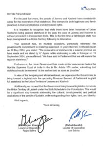 राहुल गांधी और मल्लिकार्जुन खरगे ने प्रधानमंत्री मोदी से आग्रह किया है कि केंद्र शासित प्रदेश बने जम्मू-कश्मीर को पुनः पूर्ण राज्य का दर्जा दिया जाए। नेताओं ने अपने पत्र में प्रधानमंत्री के पूर्व बयानों का हवाला देते हुए यह बात कही कि आपने खुद कई मौकों पर राज्य का दर्जा बहाल करने का वादा किया था।-