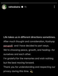 “काफ़ी सोच-विचार और आत्ममंथन के बाद, कश्यप और मैंने आपसी सहमति से अलग होने का फ़ैसला किया है। हम एक-दूसरे के प्रति आभार के साथ अपने जीवन में शांति, विकास और उपचार के रास्ते पर आगे बढ़ने का विकल्प चुन रहे हैं। इस सफर की सारी खूबसूरत यादों के लिए मैं आभारी हूं। कृपया हमारी निजता का सम्मान करें।”