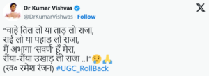 UGC के खिलाफ कुमार विश्वास ने X पर किया विरोध-“मैं अभागा ‘सवर्ण’ हूँ”..