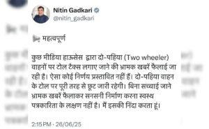 Fact Check Report: “बाइक और स्कूटर से टोल टैक्स वसूली” की खबर पूरी तरह फर्जी निकली, नितिन गडकरी ने किया खुलासा! Posted on 26/06/2025